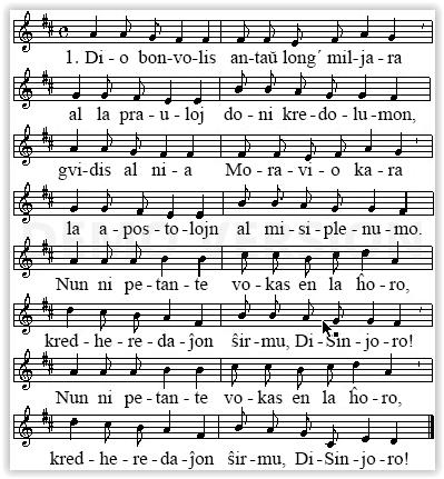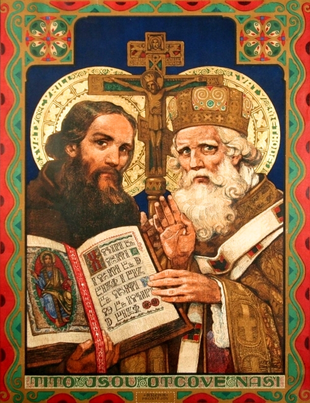 La tesalonikaj fratoj en la 9-a jc. venis al Granda Moravio por disvastigi kristanan religion per komprenebla lingvo. Per ilia misio en ĉeĥaj landoj ili tie metis fundamentojn de la kristanismo. Bildo de Jan Köhler el la 19-a jc. DIO BONVOLIS ANTAŬ TEMP´ MILJARA Melodio pola. Ĉeĥan tekston de Vl. Šťastný el 1893. Tradukis en 2006 Josef Cink