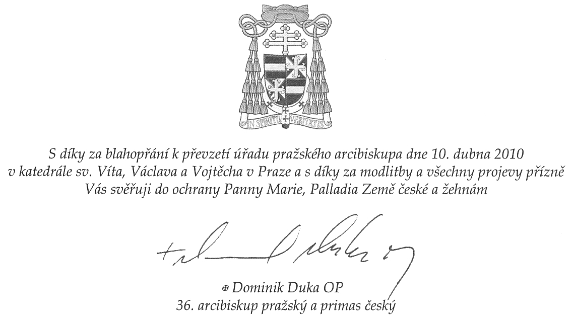 de Ĉefepiskopo de Prago Mons. Dominik Duka OP Via eminenco, estimataj patroj episkopoj, estimata sinjorino Klausová, estimataj sinjoroj ministroj, parlamentanoj kaj publikaj funkciuloj, karaj fratoj en Krista sacerdoteco, fratoj kaj fratinoj en kredo je Jesuo Kristo, estimataj televidaj spektantoj, radioaŭskultantoj,