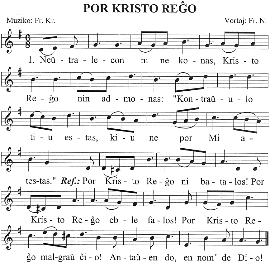 2. Kruco estas lumo nia, / stelo nur portilo ĝia. / Post la Krucstandardo Reĝa / iras ni laŭ vojo leĝa. Ref.: Por Kristo...3. Ni preĝadu, laboradu, /