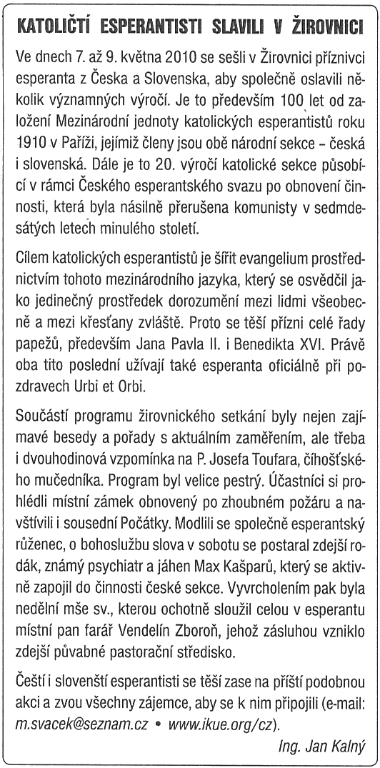Karaj gefratoj! La partoprenintoj de la maja renkontiĝo en urbo Žirovnice certe ĝin havas ankoraŭ en viva memoro kiel sukcesan kaj tre belan aranĝon, dum kiu oni rememoris dudek jarojn de la novtempa historio de la Ĉeĥa IKUE-Sekcio. Kaj nur ok personoj el nia lando ĝuis ankoraŭ pli grandan jubileon - la centjariĝon de IKUE, kiu ĝuste antaŭ cent jaroj en la jaro 1910 estis fondita en Parizo. Reprezentantoj el 12 landoj fine de la nunjara junio denove kolektiĝis en Parizo partoprenante la 63-an Kongreson de IKUE, por omaĝi tiun ĉi gravan jubileon de IKUE. La unu semajnon daŭranta kongreso en tre atraktiva loko de Parizo tuŝapude de la fama Baziliko de Sankta Koro sur monteto Montmartre certe digne plenumis sian celon. Danke al Dio realiĝis delongtempa revo soleni tiun ĉi gravan jubileon de IKUE ĝuste en la urbo de ĝia fondo. La plej grandan meriton pri ĝia efektivigo sendube havas vicprezidantino de IKUE fratino Marija Belošević, kiu estis la ĉefaranĝantino de la kongreso kaj el sia lando Kroatio organizis ĉion bezonatan. Ankaŭ gravan rolon tiucele ludis frato Daniel Chevalier loĝanta ekster Parizo, kiu ne nur rekomendis tiun lokon por okazigo de la kongreso, sed ankaŭ helpis en ĝia efektivigo. Tiu ĉi grava jubileo de IKUE meritas, ke ni al ĝi dediĉu ĉiujn kvar kolorajn bildajn paĝojn, kiuj pli efike proksimigos al vi, karaj legantoj, la dumkongresajn eventojn, kiuj kompletigas la tekston priskribantan la kongreson sur la paĝoj 63-69. Ankaŭ pri la kongreso estas pretigita bilda prezentaĵo kun teksta kaj parola akompano. Ne nur la Ĉeĥa IKUE-Sekcio festas sian dudekjariĝon, sed ankaŭ nia revuo Dio Benu nunjare havas dudek jarojn de sia ekzisto. La kompleta arkiva ĝia kolektaĵo verŝajne ekzistas nur ĉe mi, sed ekzistas la ebleco viziti ĝian komplete ekzistantan arkivon sur la interretaj paĝoj de la Ĉeĥa IKUE-Sekcio: http://www.ikue.org/cz. Ekzistas tie ankaŭ ebleco trovi kompletan liston de ĉiuj artikoloj aperintaj dum dudek jaroj sur la paĝoj de Dio Benu, kaj per simpla klako akiri la deziratan artikolon. Kelkaj el niaj membroj jam demandis, kion ni plu planas aranĝi. Sur la paĝo 81 estas por la ĉeĥlingvaj legantoj publikigita rezulto de la enketo, kies demandilo estis almetita al la pasinta DB. Bedaŭrinde, plenigitan demandilon resendis nur malmultaj personoj, tial estas malfacile fari fidindan konkludon. Ĝi do nesufiĉe plenumis atendatan celon. La rezulto de la enketo ne tute bone informis nin, ĉu ekzistas sufiĉa nombro da tiuj, kiuj dezirus partopreni la duan nunjaran semajnfinan renkontiĝon. Tial ni ne riskis mendi la lokon por ĝi. Al membroj de Ĉeĥa E-Asocio mi rekomendas aliĝi al ĝia konferenco okazonta de la 24-a ĝis la 26-a de septembro en Poděbrady, kie ni povas renkontiĝi. Sed ni jam nun rigardu en la venontan jaron, kiu rapide proksimiĝos. Niaj karegaj gefratoj el Slovakio invitas nin renkontiĝi de la 13-a ĝis la 15-a de majo 2011 en pilgrimloko Marianka, situanta nur 12 km de la ĉefurbo Bratislava. Multaj el ni rememoras iamajn belegajn renkontiĝojn en urbo Žilina en Slovakio, do tutcerte atendas ankaŭ belegaj travivaĵoj la partoprenontojn en Marianka. Ni esperas, ke partoprenos ankaŭ gefratoj el najbaraj landoj. Planu jam nun la partoprenon, pli detale informos vin nia revuo Dio Benu. En feriaj monatoj ni verŝajne organizos kvintagan aŭ unusemajnan restadon en Žirovnice kun kursoj de Esperanto, kaj plua riĉa programo. La daton, kiu ne kolizios precipe kun la dato de la 64-a IKUE-Kongreso en Kroatio, ni ĝustatempe al vi anoncos. Dian benon al vi deziras Miloslav Šváček.