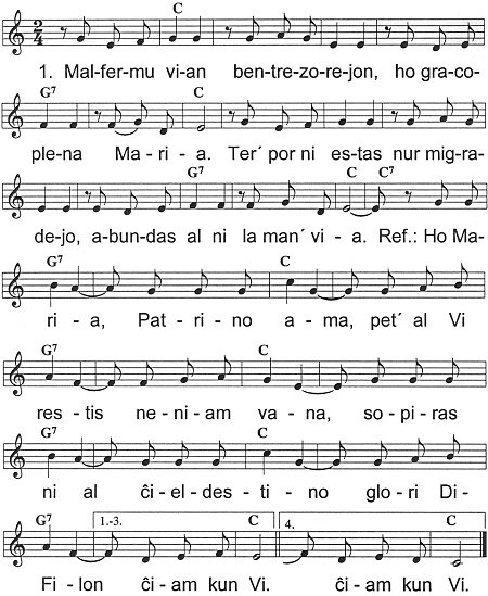 2. Nin priornamu per Dia graco, / tiam ni plaĉos Filon vian, / Kristo invitos el migra spaco / nin en feliĉan Regnon sian. Ref.: Ho Maria, Patrino ama ...