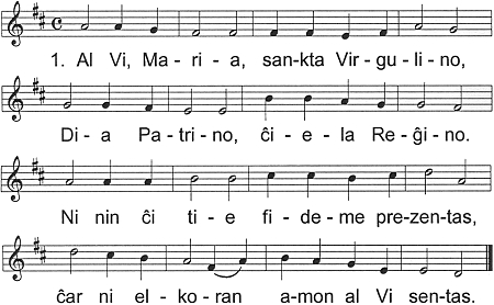 2. Ĉar Vi, Patrino, estas ne nur Dia, / sed ankaŭ kara bona panjo nia. / Viaj okuloj ĉiam nin rigardas / kaj via povo nin patrine gardas.