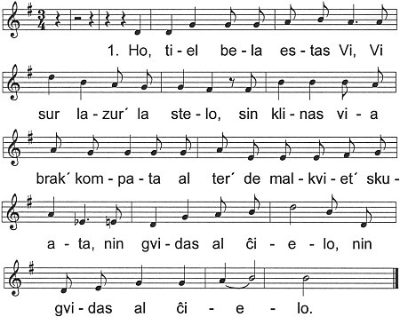 bela estas Vi, / Vi Dipatrino pura, / dum viv´ surtera nin protektu, / post