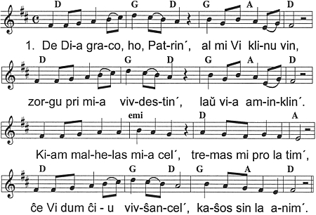 nia tera voj´. / Kaj al ni venu lia grac´ / per lia klara vid´, / al la