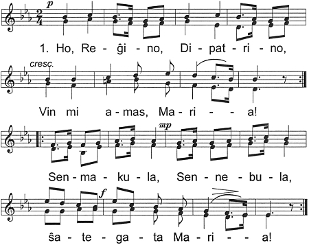 2. Kron´ Virina, Ĝoj´ patrina, Sankta Virga Maria! / Nin denove ĉiopove helpi venu, Maria! 3. Dolorita, Kortuŝita sub la Kruco, Maria! / Nin plendantajn krucportantajn aŭdu, vidu, Maria!