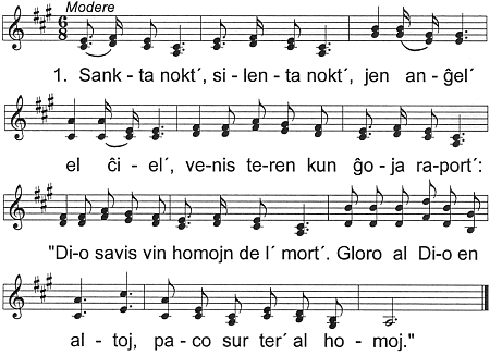 2. Sankta noktī, silenta noktī, / en Betlehemī sen la hejmī, / Vortī de Dio fariĝis homo, / por vin gvidi al ĉieldomo. / Gloro al Dio en altoj, / paco sur terī al homoj. 3. Sankta noktī, silenta noktī, / en la stalī ĉe la valī, / zorge ĉirkaŭvindita knabetī / kuŝas pace, jen, en la kripetī. / Gloro al Dio en altoj, / paco sur terī al homoj. 4. Sankta noktī, silenta noktī, / Maria kun sia / ĉarma knabo sur pajlo kaj fojnī, / vin atendas por doni gracojn. / Gloro al Dio en altoj, / paco sur terī al homoj. 5. Sankta noktī, silenta noktī, / iru vi do al li, / klinu vin en humila adorī/ kaj donacu volonte la korī. / Gloro al Dio en altoj, / paco sur terī al homoj.