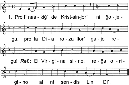2. Laŭ la profetaĵa vort´, ni ĝojegu, / teren venis la Savont´, gajo regu! Ref.: El Virgina sino ... 3. Elaĉetis sin homar´, ni ĝojegu, / per la Krista sava far´, gajo regu! Ref.: El Virgina sino ...