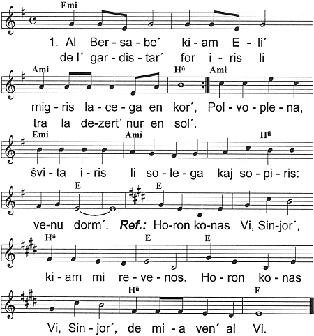 2. Ĝemis do li: venas la fuĝ´, / estas mi nul´, povruleg´. / Ĉien tra mond´ trafas Di-juĝ´, / scias Li pri mia pek´. / Mi jam scias, mi ekkonas, / ke ĉi ter´ ne savon donas, / venu dorm´. Ref.: Horon konas Vi, Sinjor´ ... 3. Kiam Eli´ dormsatis jam, / venis al li la anĝel´: / Prenu vi jen akvon kun pan´, / manĝu, leviĝu de ter´! / Novajn fortojn vi akiros, / vi ankoraŭ longe iros / sur la voj´. Ref.: Horon konas Vi, Sinjor´ ...