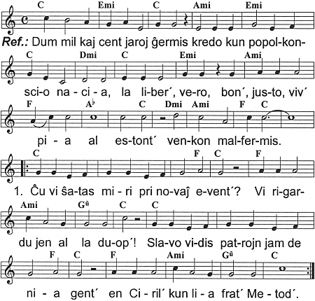 2. Propralingve laŭdi Dion kun fervor´ / estis sensacio kaj kuraĝ. / Al ĉi fratoj volis ligi sin popol´, / Rom´ konfirmon donis pri l´ novaĵ. Ref.: Dum mil kaj cent jaroj ...